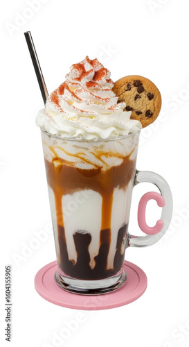 Decadent Layered Sundae Drink with Whipped Cream, Caramel Drizzle, Strawberry Sauce, and Cookie Isolated