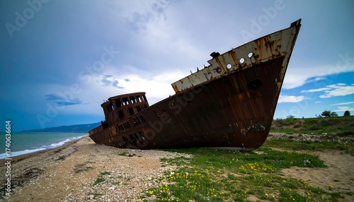 Decaying ship on sand