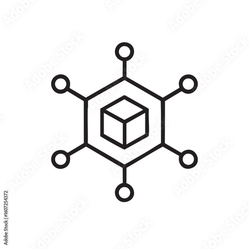 Decentralized Network Icon with Cube in Hexagon Connected to Nodes Representing Blockchain or Distributed Systems
