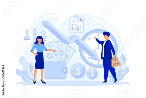 Decline stage concept set. Finance crisis with falling down graph and income decrease. Idea of bancruptcy and business risk. Money loss.