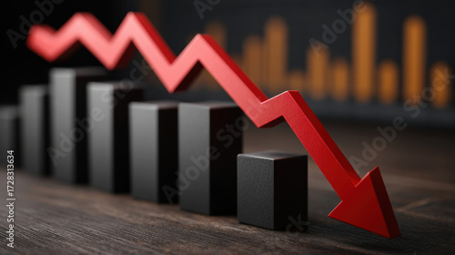 Declining business graph with red arrow pointing downwards over black bar chart on wooden surface, symbolizing economic downturn and market decrease in dramatic visual style