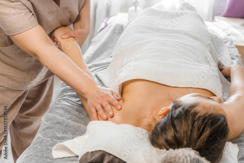 Decontracting hand massage to relieve tension and pain. Spa, health and relaxation concept