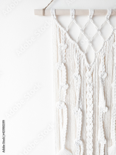 Decoração de parede em artesanato macramé em grande plano num fundo branco