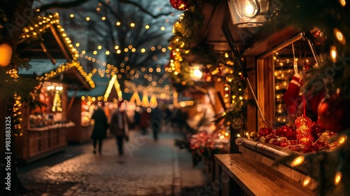 decorated christmas market stalls with lights and festive ornaments, a magical atmosphere on a cozy winter evening, people shopping and enjoying the holiday season. Happy New Year Merry Christmas