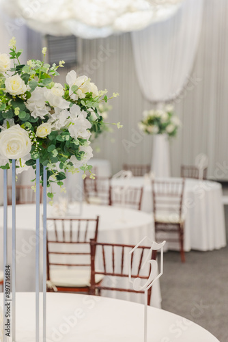Decorated interior for festive event. Fancy table set for dinner with white flower composition in restaurant, luxury interior background. Wedding elegant banquet decoration arranged by catering