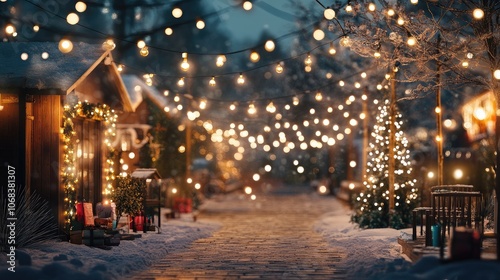 Decorated outdoor festival scene with string lights and snow, with a central copy space for a festive greeting.