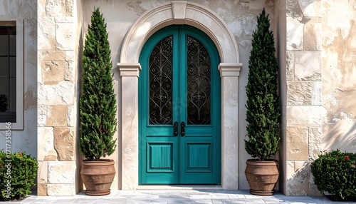 Decorative arched teal double doors with black wrought iron grills set in stone facade with terracotta potted evergreens for formal architectural and lifestyle design visuals
