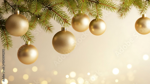 Decorative Christmas Baubles Hanging on Pine Branches in Warm Festive Interior with Soft Bokeh Lighting