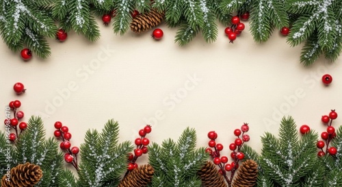 Decorative Christmas Border with Pine Branches Red Berries and Pinecones on Light Background