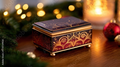 Decorative gift box with intricate designs placed on a wooden table, surrounded by festive lights and ornaments