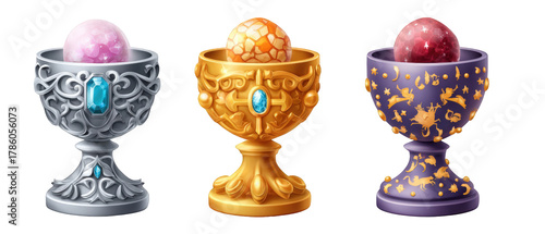 Decorative goblets with colorful eggs, showcasing intricate designs and vibrant colors