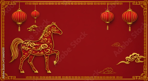 Decorative horse on red background with lanterns symbolizing 2026 Year of the Fire Horse, representing cultural heritage, tradition, and celebration, ideal for New Year promotions and themed events.