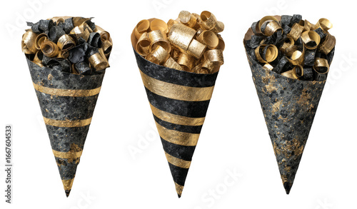 Decorative Party Horns with Metallic Confetti on Transparent Background