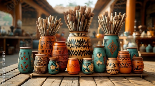 Decorative pottery and paint brushes display in rustic shop