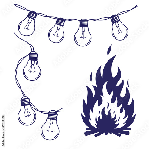 Decorative string lights and campfire illustrated in a simple hand drawn style on white background