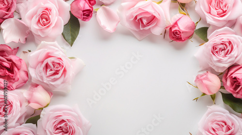 Decorative web banner. Close up of blooming pink roses flowers and petals isolated on white table background. Floral frame composition. Empty space. Generative AI