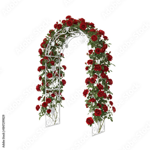 Decorative white metal archway adorned with vibrant red roses and lush green foliage.