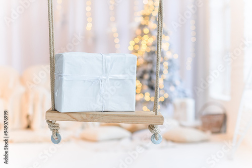 Decorative wooden swing with present at white cozy interior with Christmas decorations on background