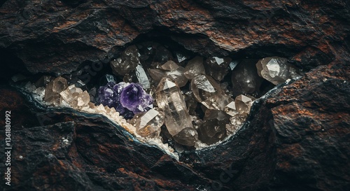 Deep Earth Treasure: Sparkling Quartz Crystals Nestled in Rock. AI Generated
