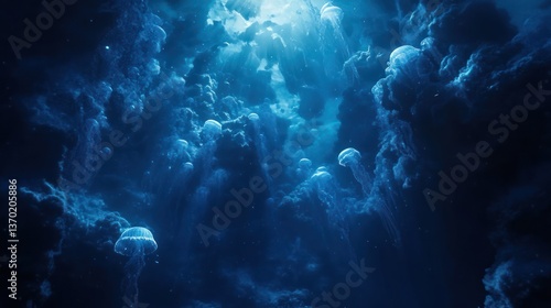 Deep ocean jellyfish clouds, underwater light show, beautiful scene