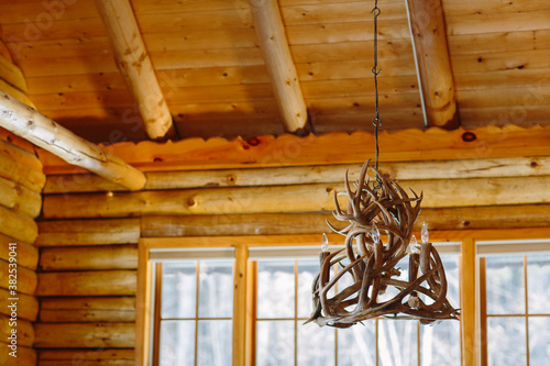 Deer Antler Chandelier in Log Cabin