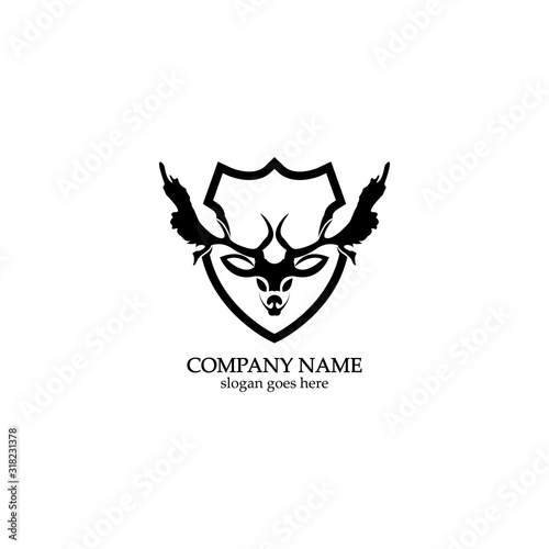 Deer hunter with shield logo design, Wild animal vector, Head deer illustration