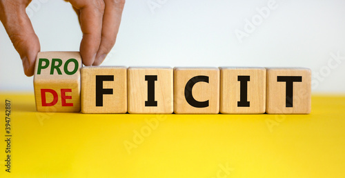 Deficit or proficit. Hand turns a cube and changes the word 'deficit' to 'proficit' or vice versa. Beautiful yellow table, white background. Business and deficit or prificit concept, copy space.