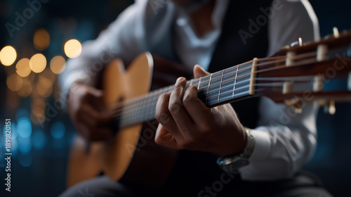 Defocused hands playing guitar at guitar lesson musical instrument instruction music education skill development performance training with copy space