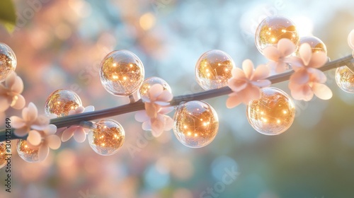 Delicate branch displaying glowing spheres and beautiful flowers gracefully