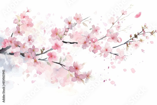 Delicate Cherry Blossom Branch Falling Petals on White Background Generative AI