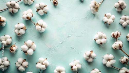Delicate Cotton Blossoms Arranged in a Symmetrical Pattern on a Light Blue Background