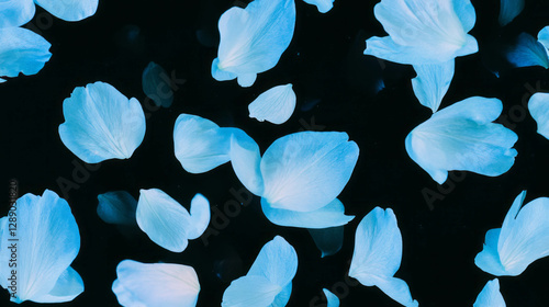 Delicate floating blue and white delphinium petals on dark background for nature and design
