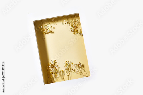 delicate frame tilted on a white surface holds dried flowers along the edges, creating a warm, minimalist composition ideal for nature, home decor, and craft projects