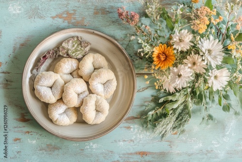 Delicate Hamantaschen Cookies Served on a Simple Plate With Colorful Feather Bouquet Against a Bright Background