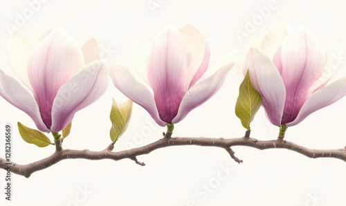 Delicate magnolia blossoms on a branch against a soft, neutral background, symbolizing spring