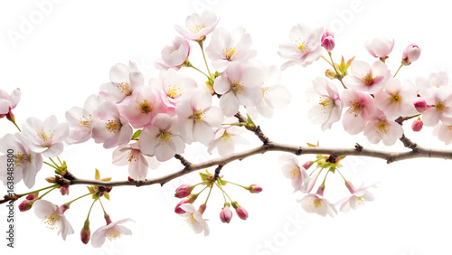 Delicate pale pink cherry blossoms bloom vibrantly on a dark branch against a stark black background