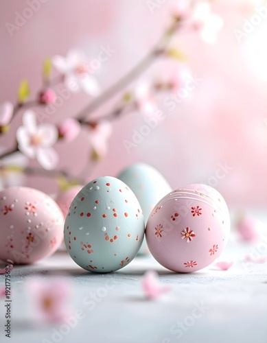 Delicate Pastel Easter Eggs with Hand-Painted Cherry Blossom Motifs and Soft Pink Petals on Blurred Spring Background