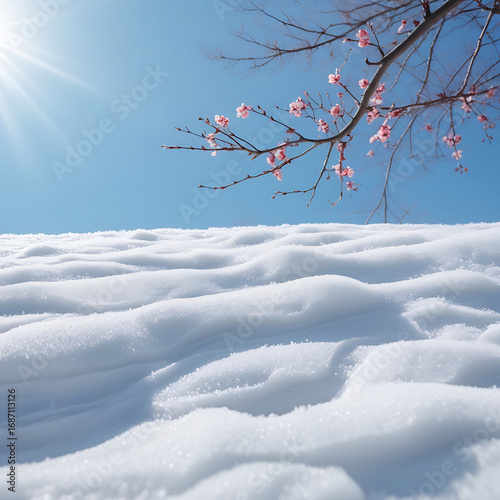 Delicate pink cherry blossom branches reach towards a vast expanse of fluffy white clouds against a clear blue sky
