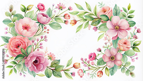 Delicate pink flowers and leaves swirl together in a whimsical watercolor frame, creating a soft, romantic, and feminine background perfect for spring and summer designs.