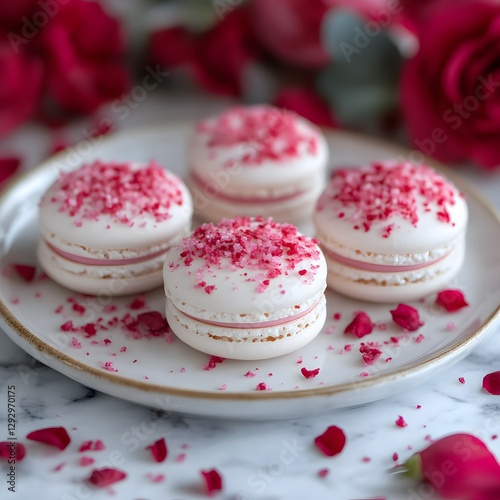 Delicate pink macarons on white plate, rose petals background