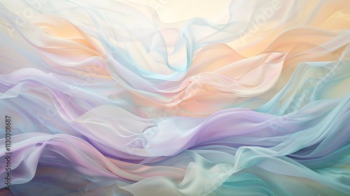 Delicate, silky waves in pastel tones of peach, lavender, and mint, gently swaying over a white canvas in a harmonious rhythm.