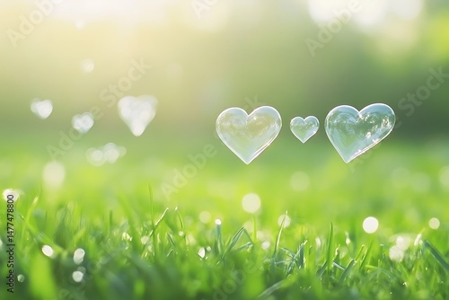 Delicate soap bubbles in the shape of hearts floating gently
