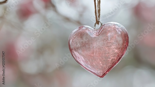 Delicate Translucent Pink Heart Ornament Hanging with Soft Focus Background - Romantic Valentine's Day Decoration