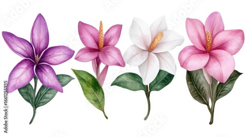 Delicate tropical blooms in watercolor, hand-drawn flowers with bright petals and leaves