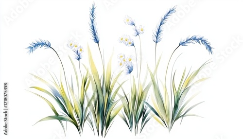 Delicate watercolor illustration of various grasses and wildflowers swaying gently in a soft breeze