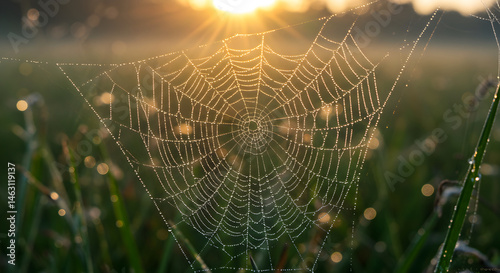 Delicate Web Adorned With Morning Dew Sparkling Under The Sunrise Glimmer