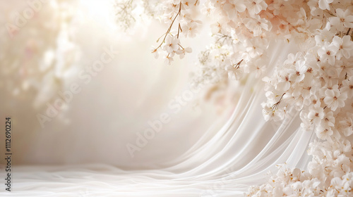 Delicate wedding backdrop with soft floral bouquets and white tulle.