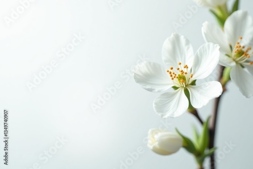 Delicate white blossom against pure white background, backdrop, delicate