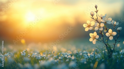 Delicate White Blossoms Bathed in Golden Sunset Light Over Tranquil Meadow with Soft Focus on Flowers and Glowing Horizon, Nature's Serenity Unveiled