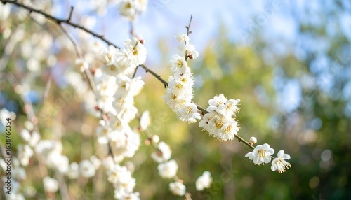 Delicate white blossoms on a branch.